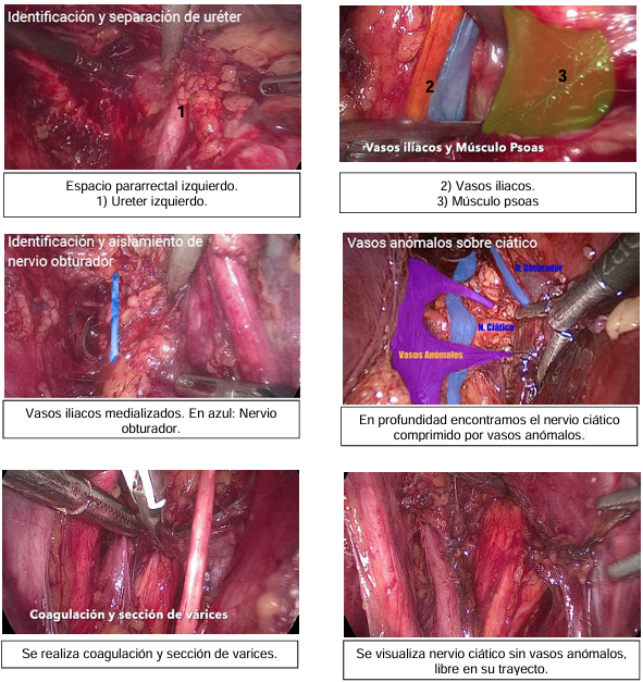 Primeramente, se realizó el abordaje del nervio ciático afectado y su descompresión en todo el trayecto hasta la salida de la pelvis, y posteriormente la cirugía de endometriosis conservadora o radical de acuerdo a la sistemática de nuestro Centro. Se describen a continuación: