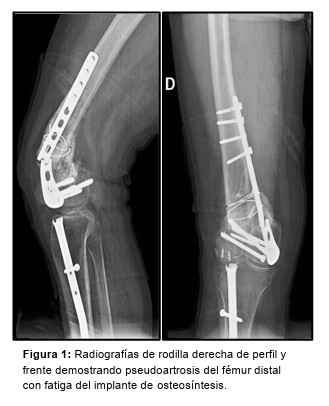 Paciente de sexo masculino, de 49 años, consulta por mínimas molestias en su rodilla derecha de 3 meses de evolución tras caída de 2,5 metros de altura trabajando como albañil. Antecedente a los 29 años de artrodesis tibiotalar y a los 44 años de osteosíntesis de fémur distal derecho con placa por medial y clavo endomedular de tibia ipsilateral. En las radiografías se observa pseudoartrosis con ruptura de la placa femoral y deseje en valgo del fragmento distal (Figura 1). Se encuentra además, una fístula sobre el tornillo de bloqueo distal del clavo de tibia. Se solicitan parámetros inflamatorios (VSG: 58 mm/1*hora, PCR: 4,65 mg/dl), escanograma y se indica descarga axial con el uso de muletas.