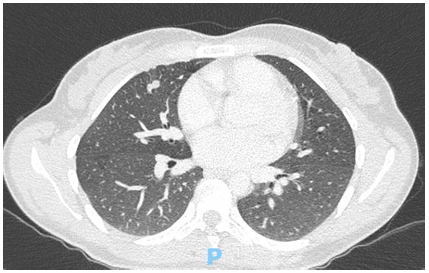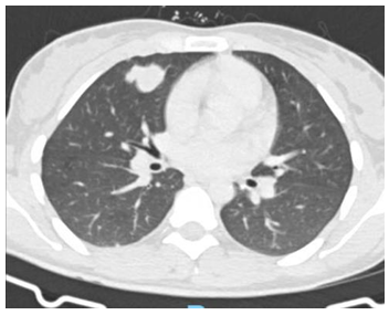 Una vez realizado el diagnóstico se reinterroga a la paciente, encontrando al interrogatorio dirigido que había presentado síntomas respiratorios (tos con hemoptisis) 5 meses previos a la consulta, por lo que concurrió a un servicio de urgencias y realizó tratamiento con antibiótico (ATB). Debido a la persistencia de sus síntomas durante 1 mes luego del tratamiento ATB, se había solicitado TC de tórax que evidenciaba imágenes nodulares con mínimo vidrio esmerilado adyacente (signo del halo) en ambos campos pulmonares, la mayor de 2,5 x 2,4 cm en segmento medial del lóbulo medio, a valorar con antecedentes y clínica y si bien son de aspecto infeccioso y/o inflamatorio se sugiere su control post tratamiento. La paciente había realizado un control posterior en el cual no le solicitaron TC control debido a mejoría de los síntomas, según refiere.