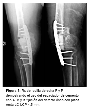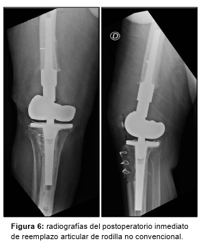 Los cultivos tomados se informan 5/5 negativos; continúa con ciprofloxacina + rifampicina por 9 semanas y se programa la cirugía definitiva de reemplazo articular de rodilla no convencional (Figura 6). Luego de 6 semanas, se realiza el 2do tiempo.