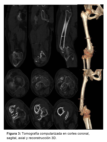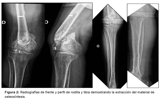 Paciente de sexo masculino, de 49 años, consulta por mínimas molestias en su rodilla derecha de 3 meses de evolución tras caída de 2,5 metros de altura trabajando como albañil. Antecedente a los 29 años de artrodesis tibiotalar y a los 44 años de osteosíntesis de fémur distal derecho con placa por medial y clavo endomedular de tibia ipsilateral. En las radiografías se observa pseudoartrosis con ruptura de la placa femoral y deseje en valgo del fragmento distal (Figura 1). Se encuentra además, una fístula sobre el tornillo de bloqueo distal del clavo de tibia. Se solicitan parámetros inflamatorios (VSG: 58 mm/1*hora, PCR: 4,65 mg/dl), escanograma y se indica descarga axial con el uso de muletas.