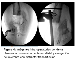 En un primer tiempo, tras un abordaje anterior recto sobre la rodilla se reseca la fibrosis, se abre cápsula y se toman nuevamente muestras para cultivos, encontrándose líquido, metalosis y severo daño condral y troclear femoral. Luego se realiza osteotomía al fémur distal, con liberación a medial y lateral, y elongación del miembro con distractor transarticular (Figura 4). Se coloca un espaciador de cemento con ATB y fijación con placa recta LC-LCP 4,5 mm (Figura 5).