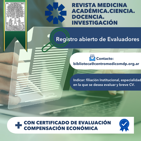 Informamos que se encuentra abierto el Registro de Evaluadores acercando a la comunidad académica y profesional la posibilidad de participar en la evaluación de artículos recibidos en sistema de revisión por pares en doble ciego. Se reciben postulaciones, a través de las cuales podemos mantener un registro permanente de especialistas por área con disposición para evaluar. Los mismos serán contactados desde la Secretaría de la Revista en el momento en el que se reciban artículos que puedan ser acordes a su especialidad o área de trabajo. La actividad cuenta con certificación oficial emitida por el Centro Médico de Mar del Plata y reviste un antecedente de vital importancia en el sistema de docencia e investigación científica. Las postulaciones deberán ser enviadas al e-mail biblioteca@centromedicomdp.org.ar, indicando su filiación institucional, especialidad y breve CV. La Revista Medicina Académica brinda instrucciones sobre la metodología de evaluación.